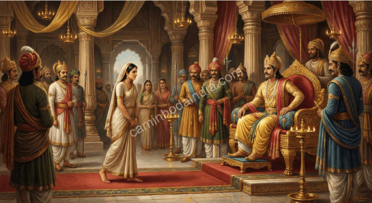 A sala inteira ficou em silêncio. Shakuntala tentou explicar o amor que haviam vivido, o casamento, a promessa. Mas sem o anel — perdido no rio — nada provava suas palavras. Os guardas trocaram olhares suspeitos, alguns com pena, outros com dureza.
